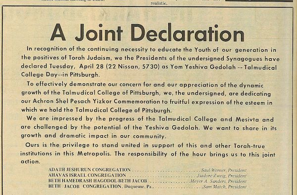“A Joint Declaration.” Advertisement from the leaders of area congregations, supporting the Talmudical College of Pittsburgh and announcing “Yom Yeshiva Gedola.”