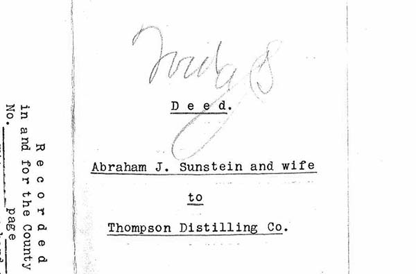 Deed from Abraham J. and Nora Sunstein to Thompson Distilling Co. English, seven pages. Date May 2, 1896 Identifier MSS1037_B001_F002_I01 Collection Sunstein, Speyer and Kingsbacher Family Papers and Photographs [MSS 1037] Source Rauh Jewish Archives at the Heinz History Center View Document