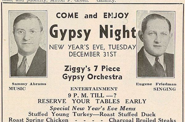 Advertisement announcing “Gypsy Night” on New Year’s Eve at Abrams & Friedman with “Ziggy’s 7 Piece Gypsy Orchestra” at 2014-2016 Murray Ave. Describes menu specials.