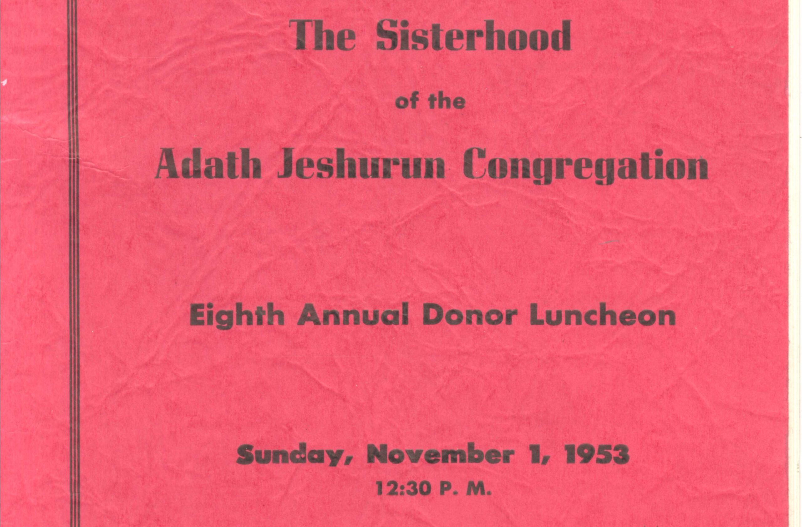 Program from the Adath Jeshurun Sisterhood’s eight annual donor luncheon held at in the synagogue’s social hall. Program includes remarks from congregants; lists sisterhood and committee members; program itinerary; and sponsors. Typescript, 19 pages, English.