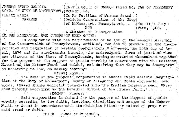 Reproduction of the charter of Anshes Svard Galicia Congregation of McKeesport. Date July 30, 1908 Identifier ACCB_V042_P496-497 Collection Allegheny County Charter Books (Vol. 42, Pages 496-497) Source Allegheny County View Document