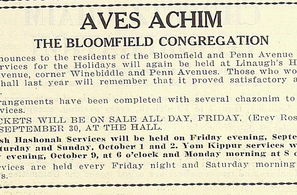 Advertisement for upcoming High Holiday services for Jewish residents of Bloomfield at Aves Achim Congregation. Services to be held at 5022 Penn Ave. Advertisement also mentions regular Friday night and Saturday morning services, as well as “all holidays” at same address. Contact is Ruben Shapera.