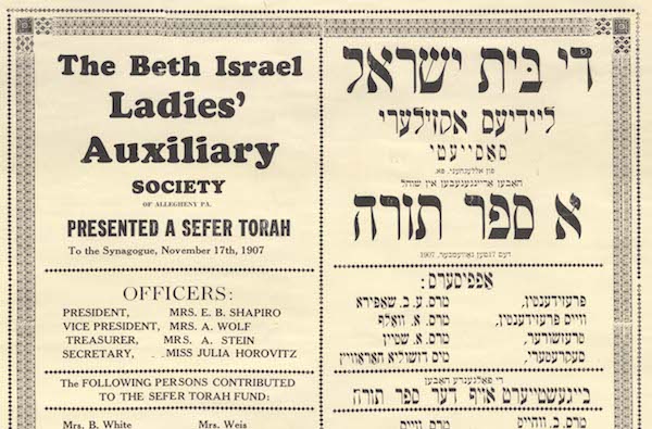 Poster created by Beth Israel Congregation (Allegheny, Pa.) Ladies Auxiliary in honor of a Torah scroll presented to the congregation. Lists officers of the organization and donors to the fund. English and Yiddish.
