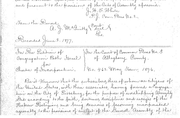 Reproduction of the charter of Beth Israel Congregation. Names listed on the charter include Samuel Frankel, Harry Frischman, Jacob Fishoff, Max Fushauske, Solomon Landman, Pinkus Leiblich (president), Morris Schneider, Elias Turner, and David Wurhaft. Handwritten, English, five pages.
