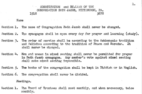 Constitution and by-laws of Congregation Beth Jacob (Pittsburgh, Pa.). Typescript, six pages.
