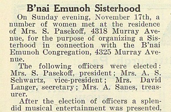 Notice of the B’nai Emunoh Sisterhood, listing meeting at B’nai Emunoh Congregation at 4325 Murray Ave.