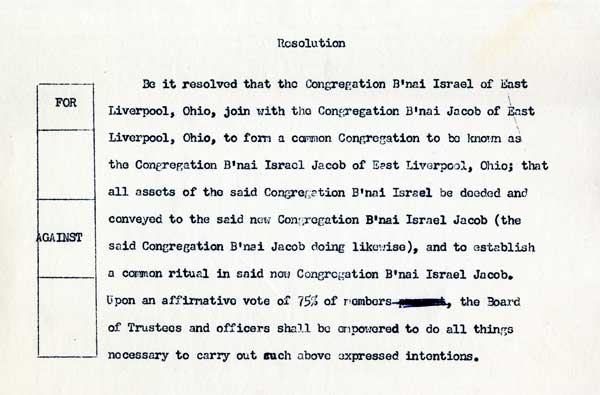 The members of Congregation B’nai Israel in East Liverpool voted in the early 1960s to merge with nearby Congregation B’nai Jacob. The new congregation was initially going to be called B’nai Israel Jacob but was later changed to Congregation Beth Shalom, meaning “House of Peace.”