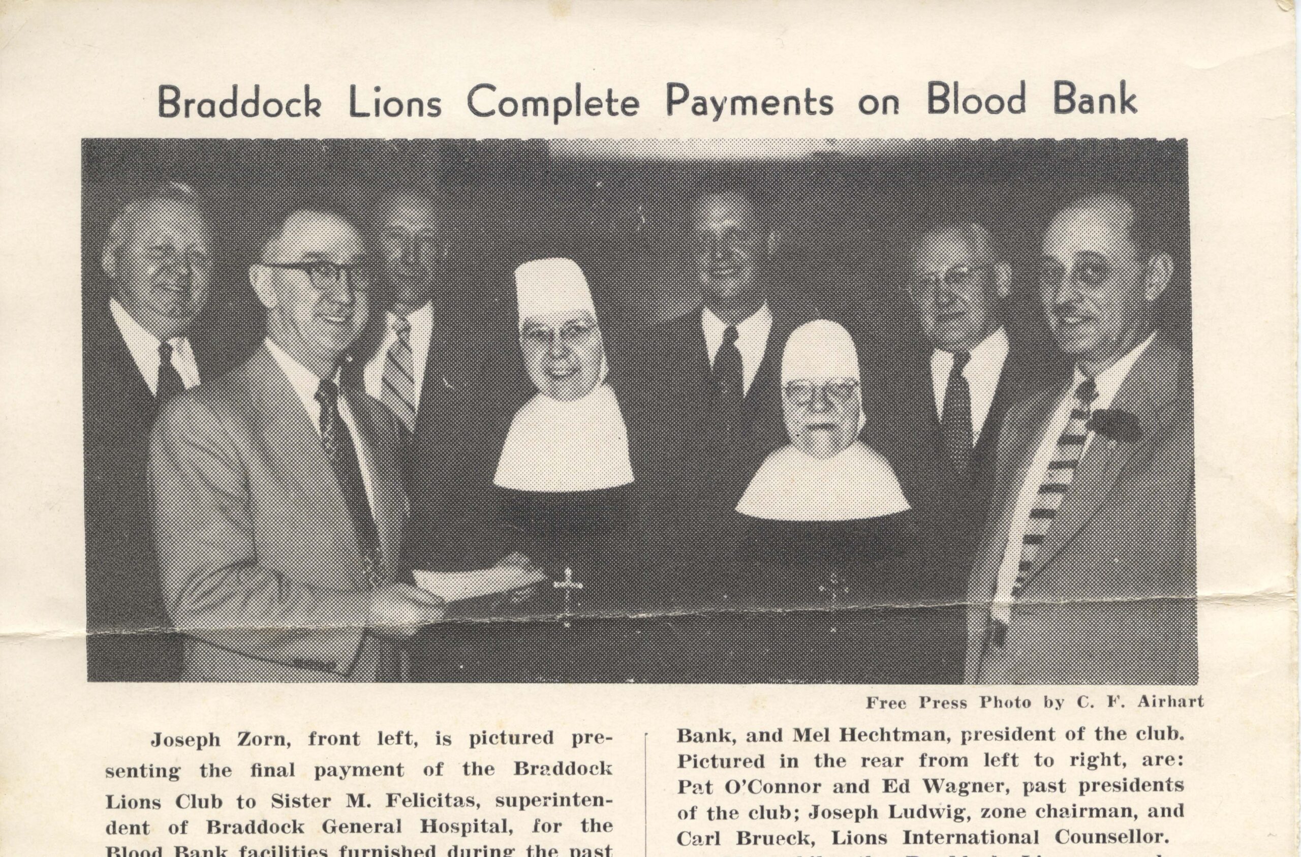 Newspaper article with photograph of the Braddock Lions Club presenting a check to the Braddock General Hospital to pay for the Blood Bank facilities. Melvin Hechtman, a Braddock Lions Club member, can be seen on the far right.
