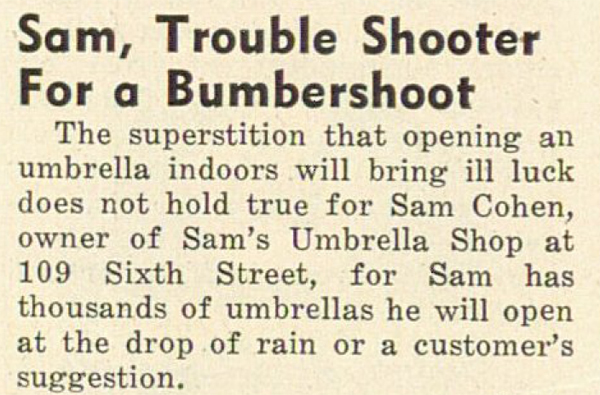 At its peak, Sam’s Umbrella Shop employed five people in a sales and repair shop at 109 Sixth Avenue. Date November 8, 1946 Identifier AJO_v24_no21_11081946_p16 Collection American Jewish Outlook Source The Pittsburgh Jewish Newspaper Project View Document