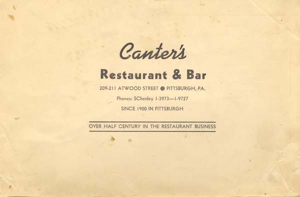 Souvenir menu from Canter’s Restaurant in the Oakland neighborhood of Pittsburgh. Includes humorous uses of Yiddish-English slang for many items, as well as for a glossary called “Daffynitions.” [Donated by Jonathan Wander family]