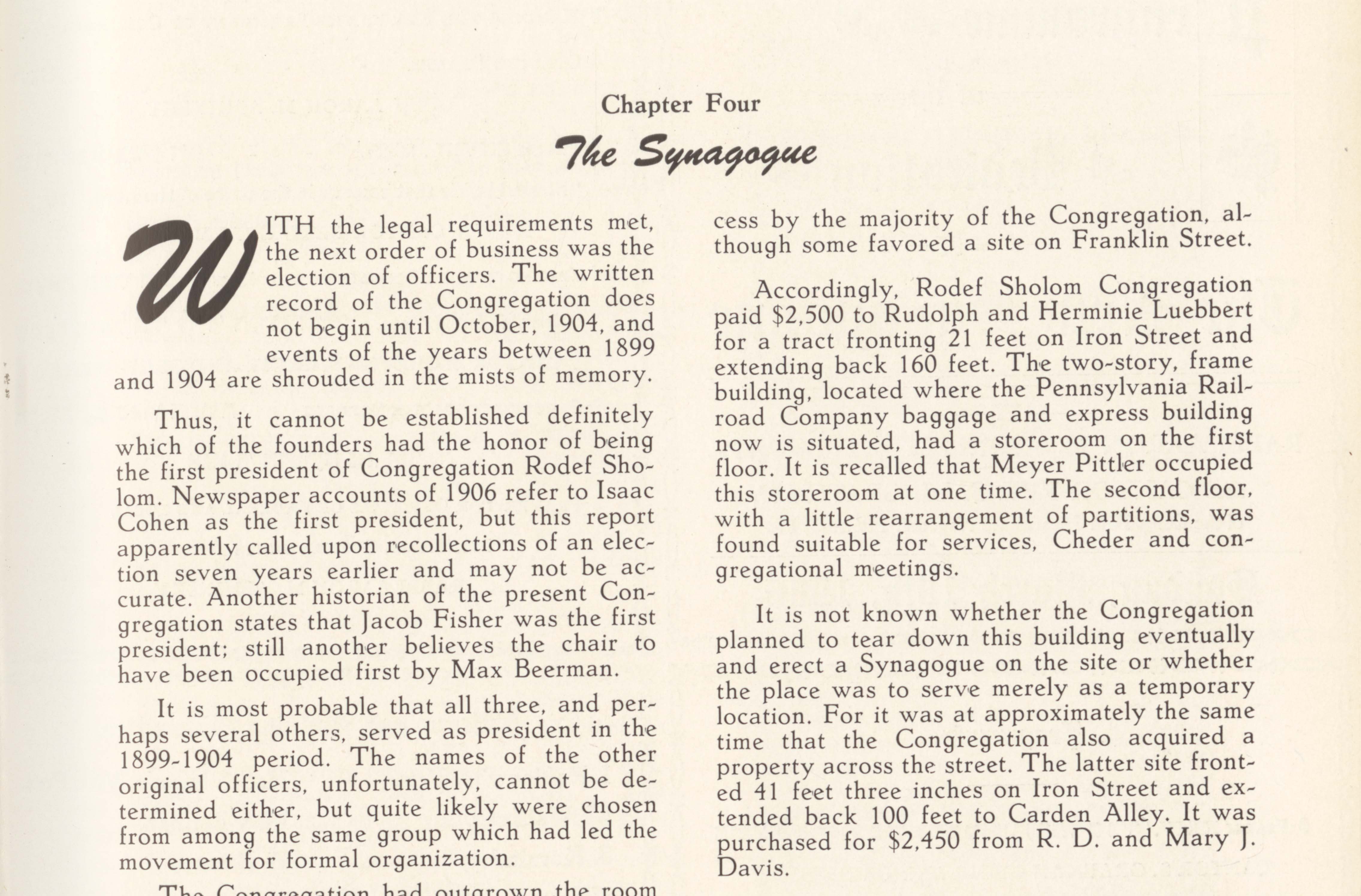 The fourth chapter from Rodef Sholom Synagogue’s (Johnstown, Pa.) 50th anniversary book. The chapter provides a history of the congregation’s synagogue. Typescript, English, three pages.