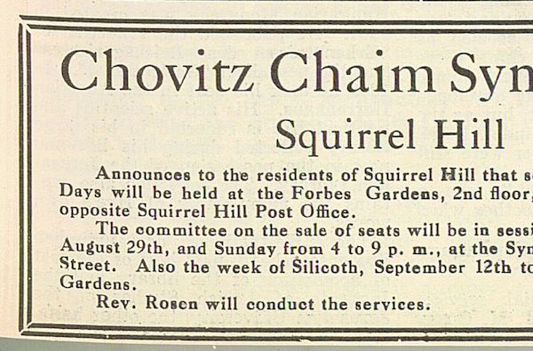 Advertisement for Chofetz Chaim Congregation, providing information about upcoming High Holiday services at 5843 Forbes Ave. and regular services at 5808 Forbes Ave., both in Squirrel Hill.