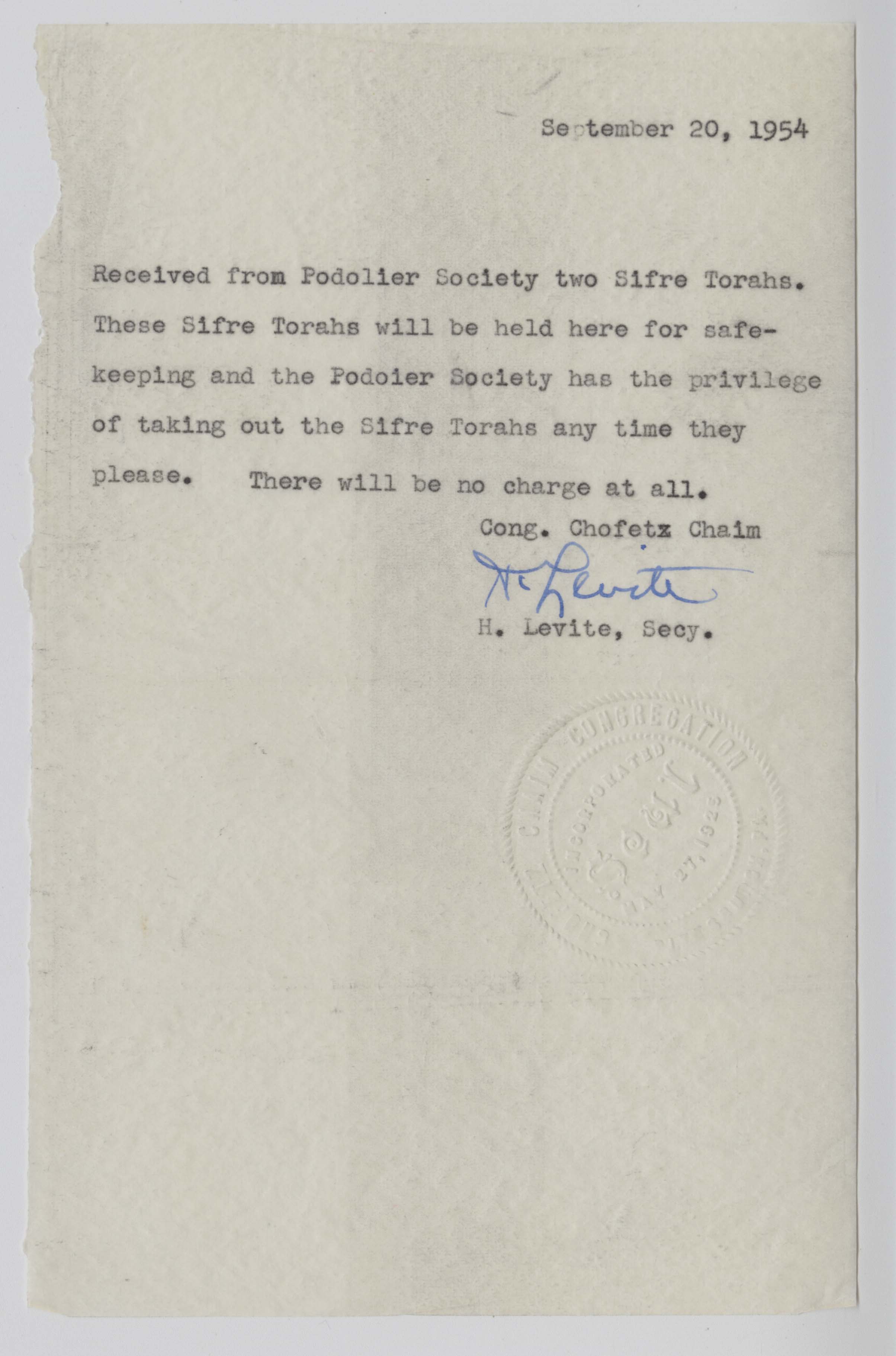 Letter from H. Levite of Chofetz Chaim Congregation, attesting to the fact that the congregation was holding two Torah scrolls on behalf of the First Podolier Independent Society. English, one page.