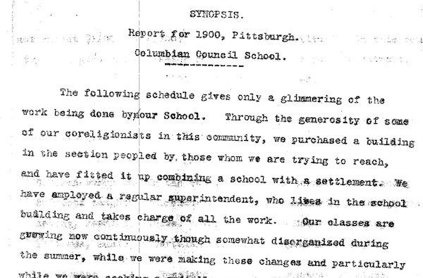 Reproduction of fundraising appeal for the Columbian Council School submitted to the Baron de Hirsch Fund by Mrs. A Leo Weil. Includes synopsis of activities of the school for 1900. Typescript, four pages.