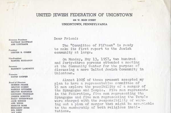 As it considered a merger between its two congregations, the Jewish community of Uniontown convened the “Committee of Fifteen” to draft a report on the proposal. The committee announced its findings at a public meeting in 1957.