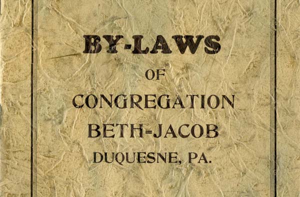 In late 1930, Congregation Beth Jacob in Duquesne adopted these by-laws to govern congregational affairs. The by-laws favored Yiddish over English for all business, required a character interview for all potential members and included provisions for five employees: rabbi, cantor, supervisor, shochet (butcher) and sexton.