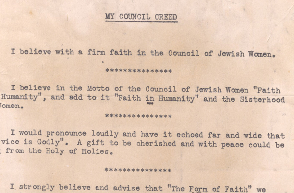 The New Castle section of the National Council of Jewish Women was founded in 1905, making it one of the oldest Jewish organizations in the city. This “Council Creed” presents the basic tenants of the organization, which often pursued problems in the society-at-large, beyond the boundaries of the Jewish community.