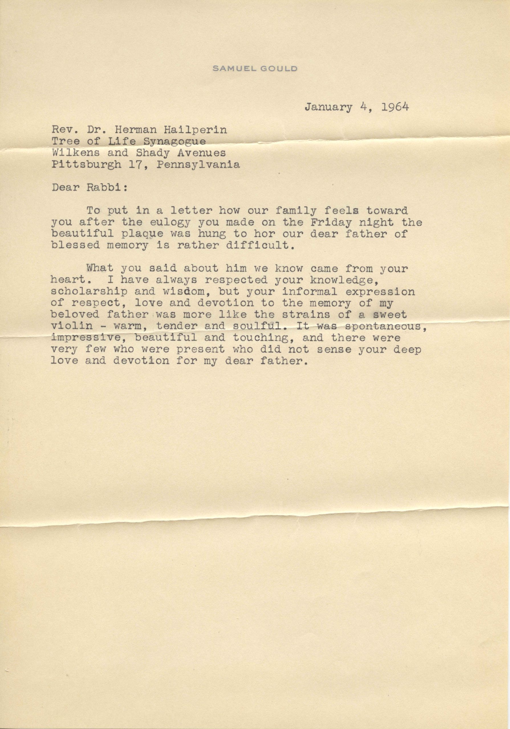 Sam Gould writes to Rabbi Herman Hailperin to express his family’s appreciation for the Rabbi’s eulogy of Abraham Goldstein.