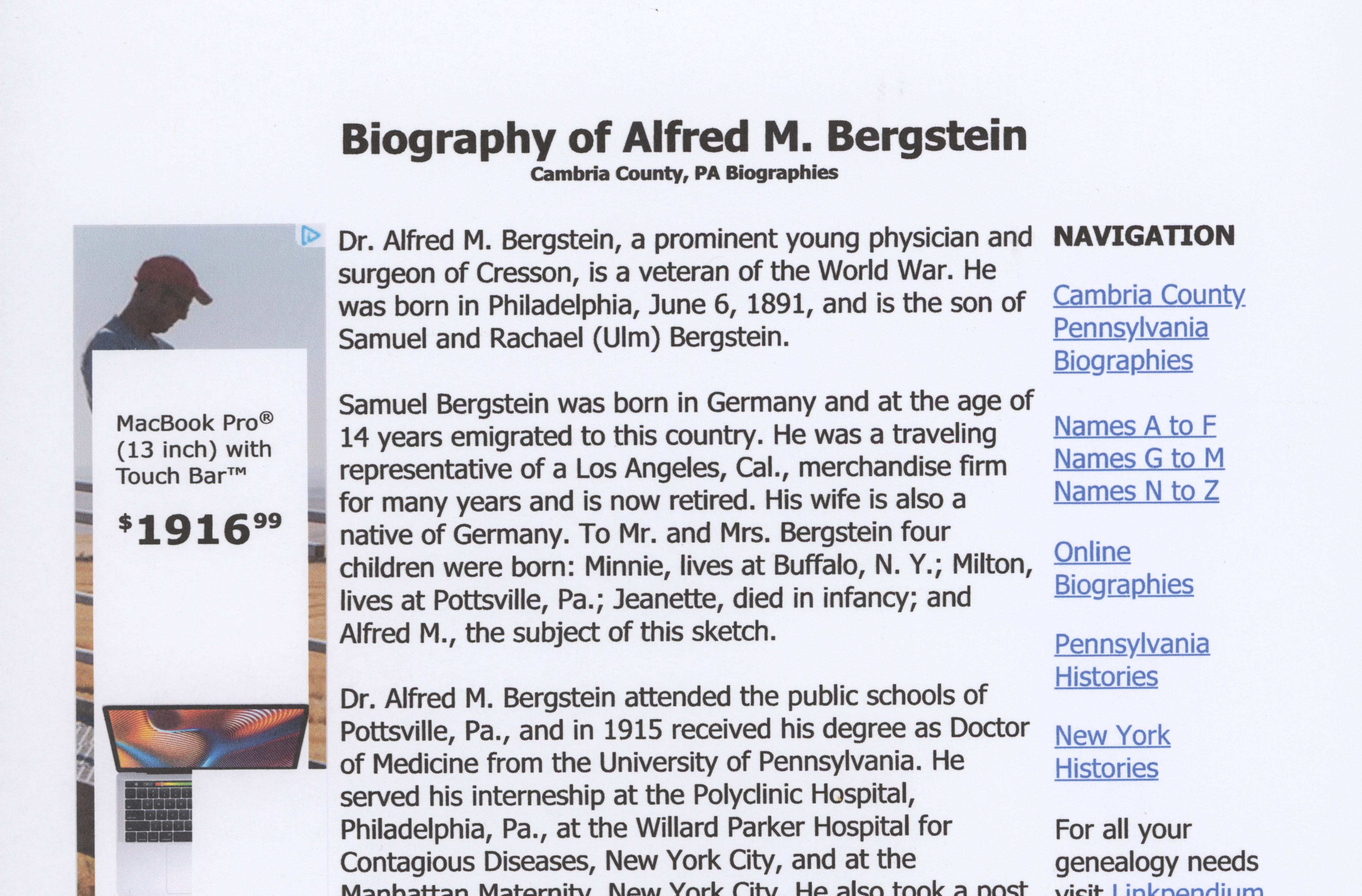 Biography of Dr. Alfred M. Bergstein. A native of Philadelphia, Dr. Bernstein moved to Cambria county as a child, he served in World War I, and was a member of the Cambria County Medical Society. This biography was written by John E. Gable. Typescript, English, two pages.