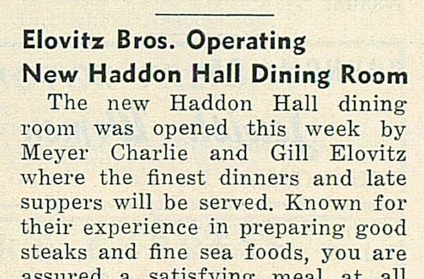 “Elovitz Bros. Operating New Haddon Hall Dining Room.” Unsigned editorial advertisement announcing the opening of a new dining room at Haddon hall at 4730 Center Ave., under the management of Meyer, Charles, and Gill Elovitz.