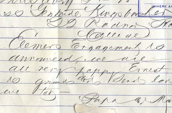 Morris and Sophie Kingsbacher sent this telegram to their daughter Gertrude after her sister Erma became engaged.
