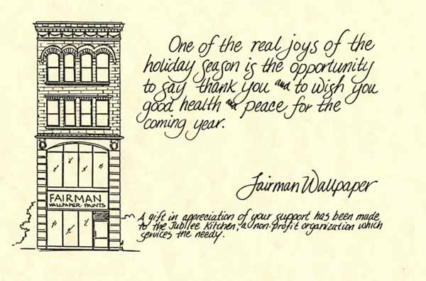 Fairman Wallpaper moved to Fifth Avenue in the 1950s and joined the Uptown business community. Date undated Identifier MSS549_B002_F004_HolidayStorefrontIllustration.pdf Collection Fairman Wallpaper and Painting Company Records Source Rauh Jewish Archives at the Heinz History Center Family The Fairman Family : View Family Member View Document