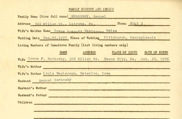 As Beth Israel Congregation prepared to occupy its new synagogue, interest in family and communal history increased. These questionnaires document the family histories of several longstanding members of the congregation.