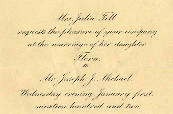 Flora Fell married Joseph Michael in Uniontown. Date January 1, 1902 Identifier MSS369_B001_F003_invitation Collection Michael Family Papers Source Rauh Jewish Archives at the Heinz History Center Family The Fell Family : View Family Member View Document