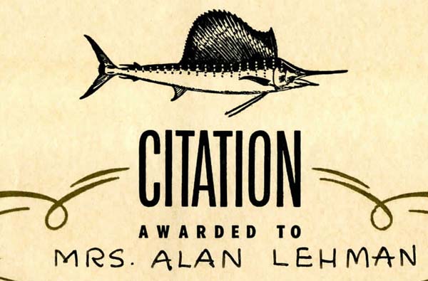 Jane Lehman received this citation for catching a sailfish in Miami Beach, Florida. Date April 26, 1948 Identifier MSS1018_B003_F003_fishing_citation Collection Lehman Family Papers Source Rauh Jewish Archives at the Heinz History Center Family The Lehman Family : View Family Member View Document