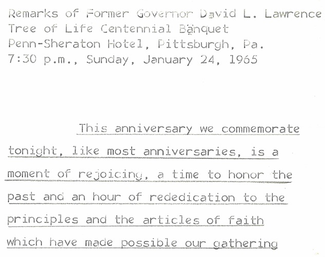 Notes prepared by Gov. David L. Lawrence for speech delivered at Tree of Life centennial banquet at Penn-Sheraton Hotel. Typescript, 17 pages.