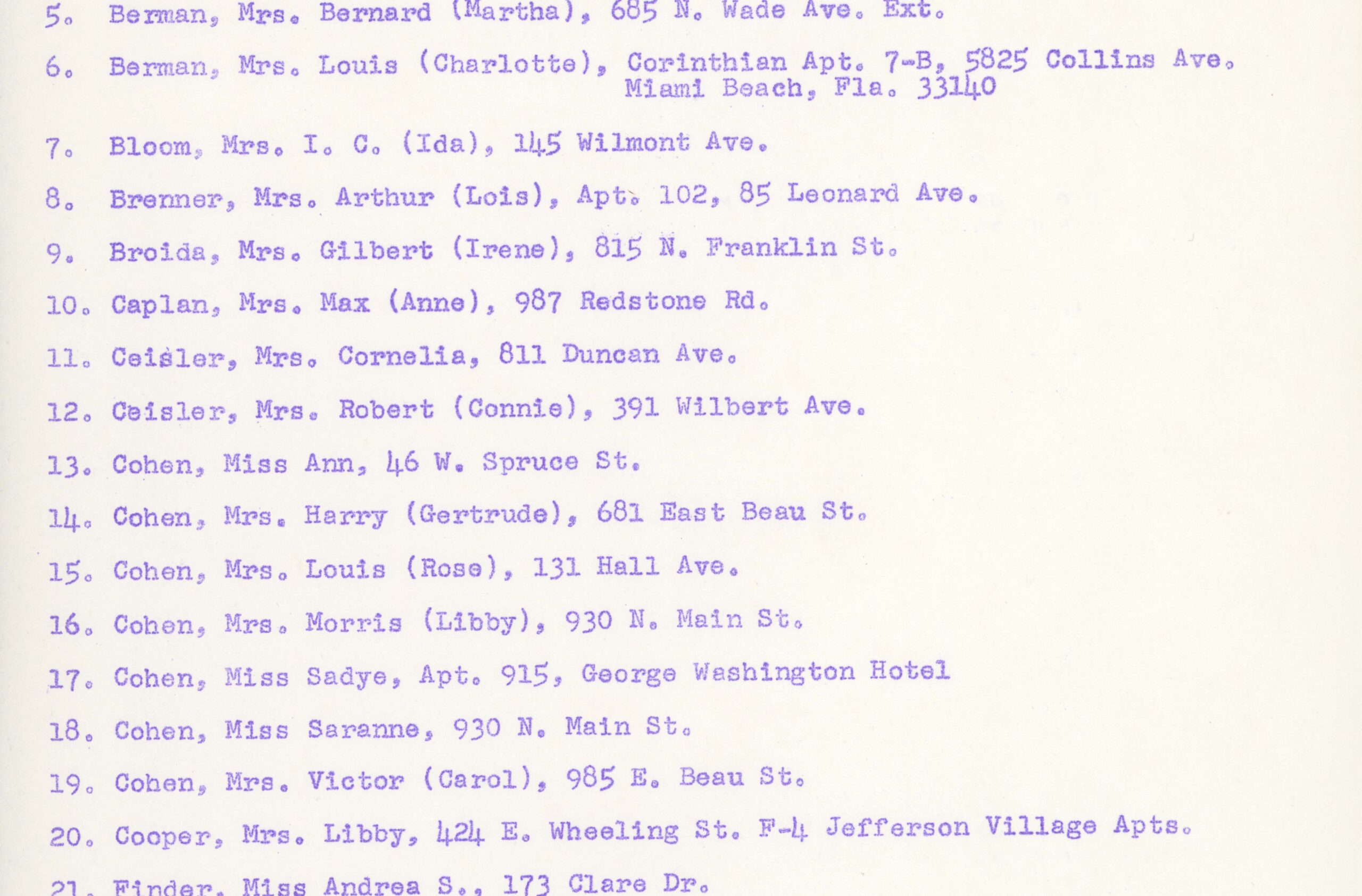 Membership list of the Washington Chapter of Hadassah that includes both name and addresses. Typescript, English, four pages.