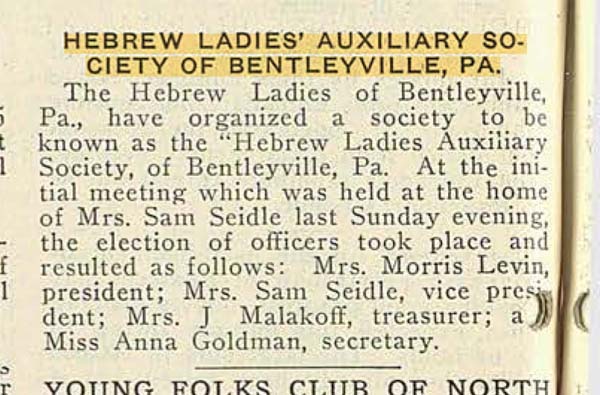 A group of Jewish women in Bentleyville, Pa. started the Hebrew Ladies Auxiliary Society of Bentleyville, Pa. in late 1916. The organization oversaw social and fundraising activities.