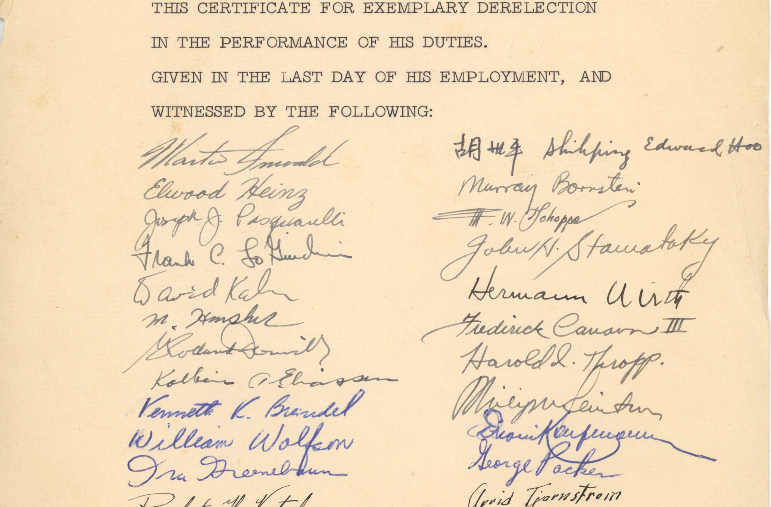 Certificate given to Herbert Mandel on his last day with the Madigan-Hyland company in Long Island City, New York.