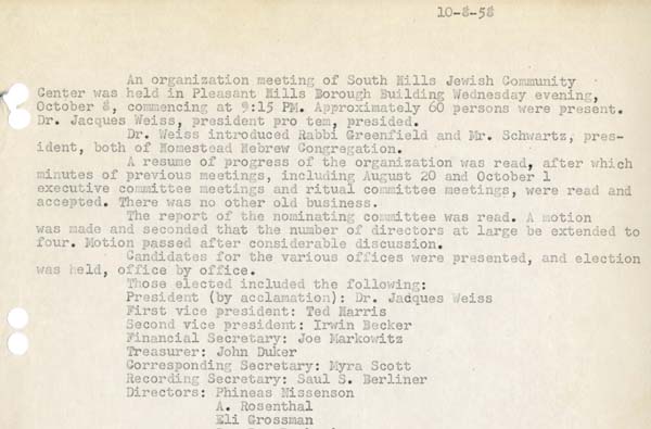 A delegation from the Homestead Hebrew Congregation visited Pleasant Hills in October 1958 to offer its facilities and to informally propose an “eventual merger” with the new South Hills Jewish Community Center, which later became Beth Israel Center. The proposed merger never occurred.