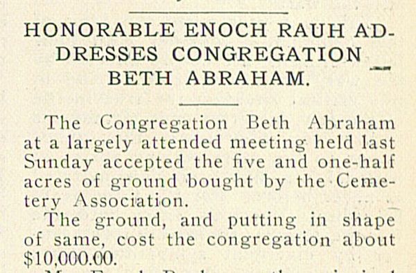 Report from recent meeting where Beth Abraham Cemetery acquired additional property at its ground, Enoch Rauh speaker.