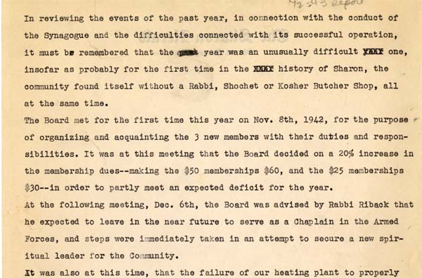 This annual report details an “unusually difficult” year in the history of House of Israel Congregation in Sharon. The community lost both its rabbi and its kosher butcher, and efforts to replace the two men proved challenging. A budget deficit forced the congregation to increase dues. In addition, problems with a faulty heating system at the synagogue “became more pronounced.”