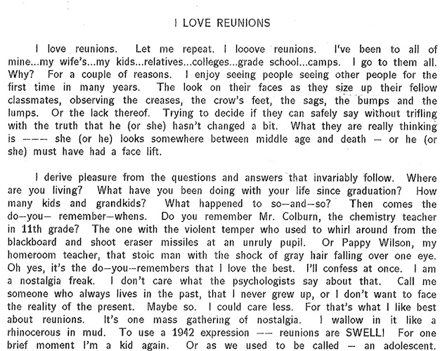 Typescript memoir by Sanford Baskind, seven pages. Written for a reunion of Taylor Allderdice High School Class of 1942. Describes the youth scene in Pittsburgh during the early years of World War II, listing nightclubs, movie theaters, restaurants, media outlets. Also provides a “senior diary” using issues of “The Foreword.”