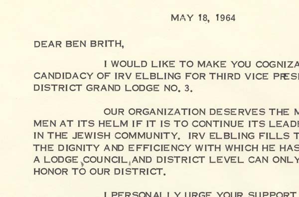 Judge Samuel Weiss campaigned on behalf of Irv Elbling for vice president of the B’nai B’rith District Grand Lodge #3.
