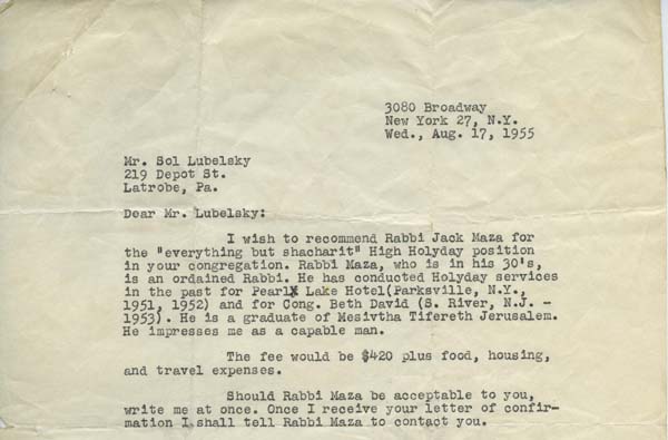 Before the High Holidays in 1955, Beth Israel Congregation wrote to Rabbi Jack G. Maza, who became better known in the 1960s as the comedian Jackie Mason.