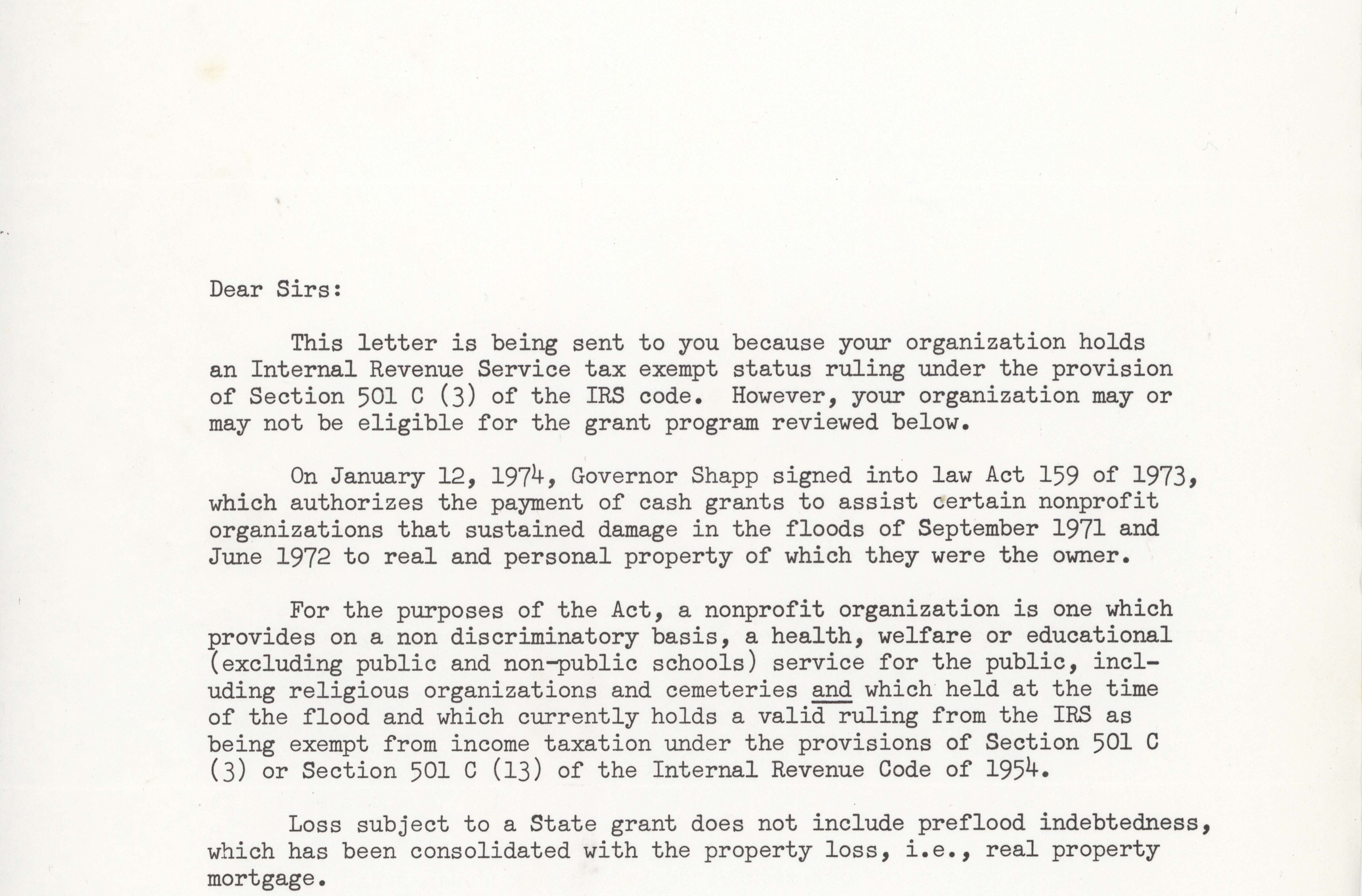 Letter from James Guest, Director of Act 159, to the North Hills Jewish Community Center informing the congregation about Act 159 which provides grants to certain nonprofit organization that sustained damage in the flood of September 1971 and June 1972. Typescript, English two pages.