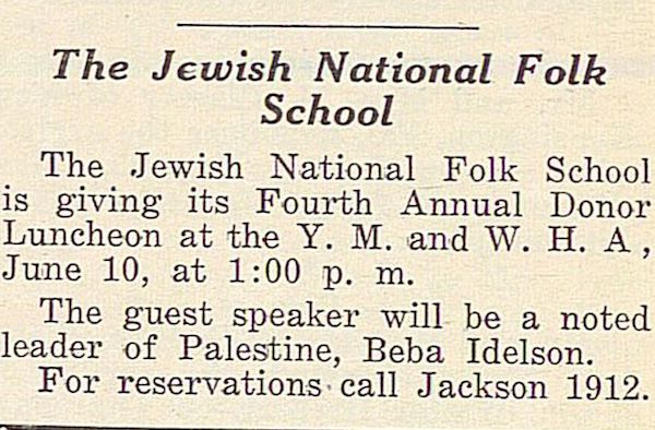 Unsigned notice announcing fourth annual donor luncheon of the Jewish National Folk Shule with guest speaker Beba Idelson.