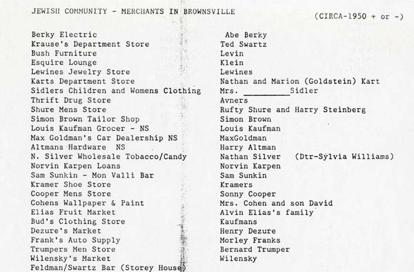 Nervin Moskovitz, one of the last Jews to reside in Brownsville, Pa., compiled a list of Jewish merchant and professionals in the town during his youth in the 1950s.