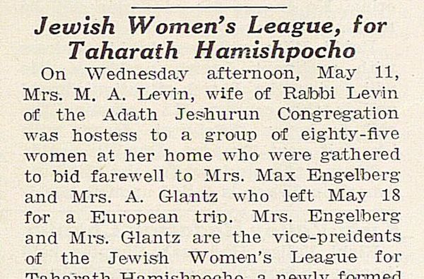 “Jewish Women’s League for Taharath Hamishpocho.” Unsigned article reporting on social event hosted by the “newly formed” Jewish Women’s League for Taharath Hamishpocho.