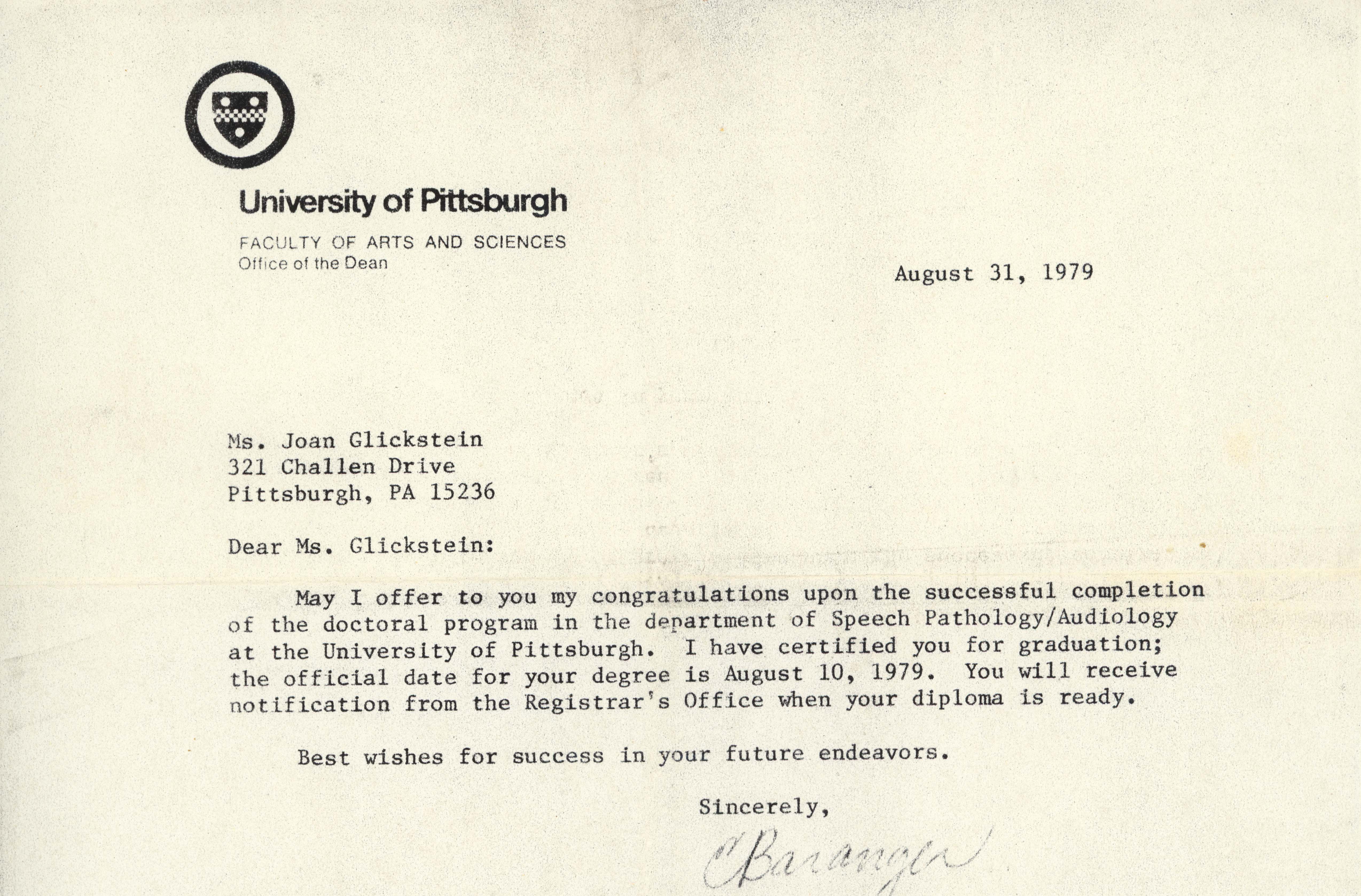 Letter from Elizabeth Baranger, Dean of Graduate studies at the University of Pittsburgh, to Joan Katz congratulating her on completing the doctoral program. Typescript, English, one page.