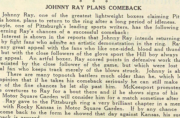 The boxer Johnny Ray, a.k.a. Harry Pitler, had a successful career in his youth and later managed Billy Conn.