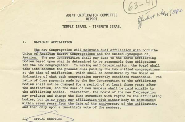 After agreeing to a merger, Tifereth Israel and Temple Israel prepared this report to address practical matters of combining two congregations with different religious backgrounds. After a contingent filed suit to prevent the merger, the committee prepared a second report as part of an attempt to settle the matter out of court.