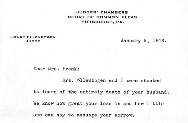 Judge Henry Ellenbogen sent condolences to Rose Buck Frank after the death of her husband Herbert Frank. Date January 8, 1946 Identifier MSS531_B002_F001_ellenbogen_letter Collection Buck-Frank Family Collection Source Rauh Jewish Archives at the Heinz History Center Family The Buck Family : View Family Member View Document