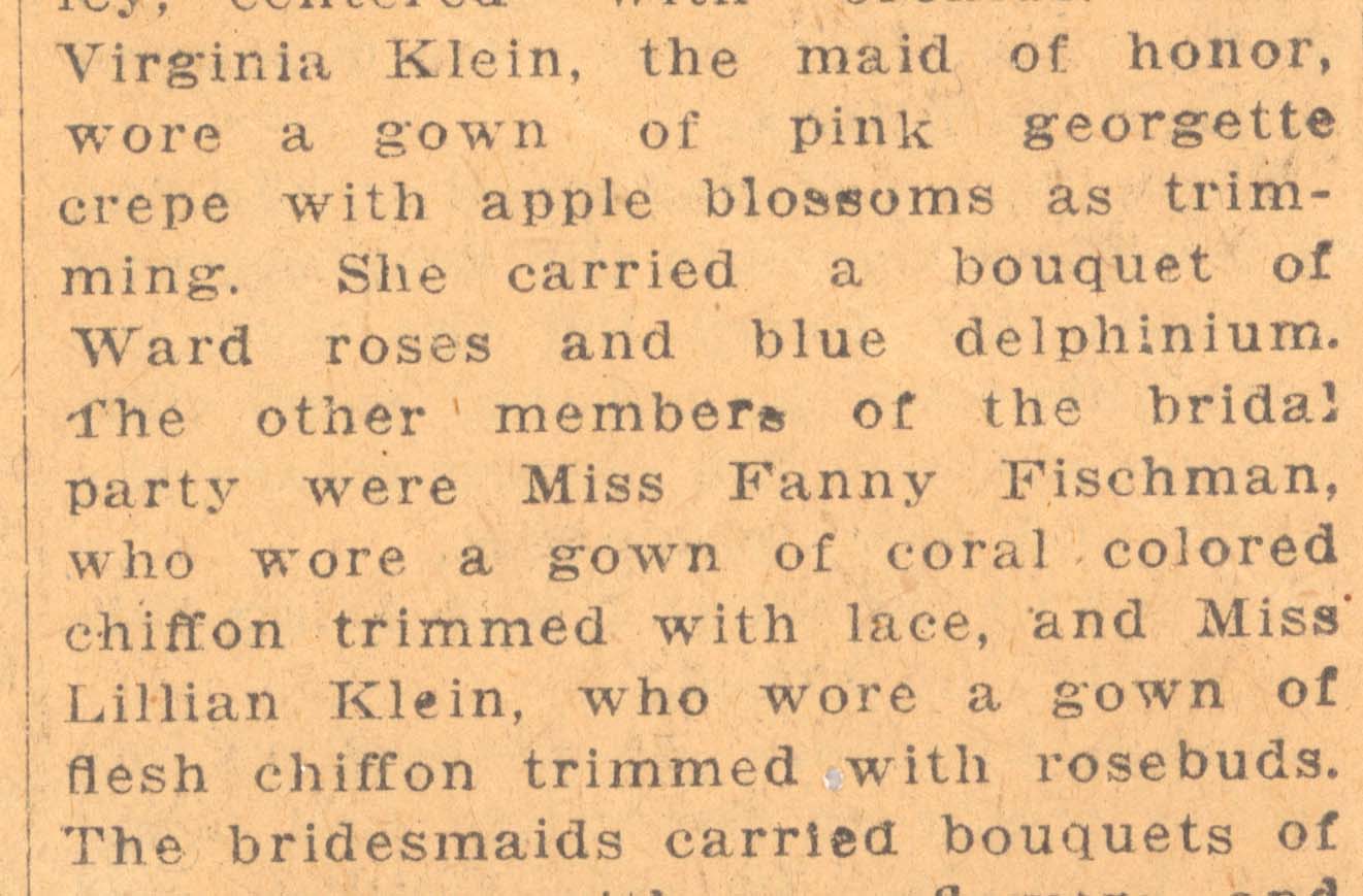 Unsigned newspaper clipping announcing the marriage of Ruth Klein to Max Fischman. The ceremony was held at the Rittenhouse and was solemnized by Rabbi S. B. Friedman. Typescript, English, one page.