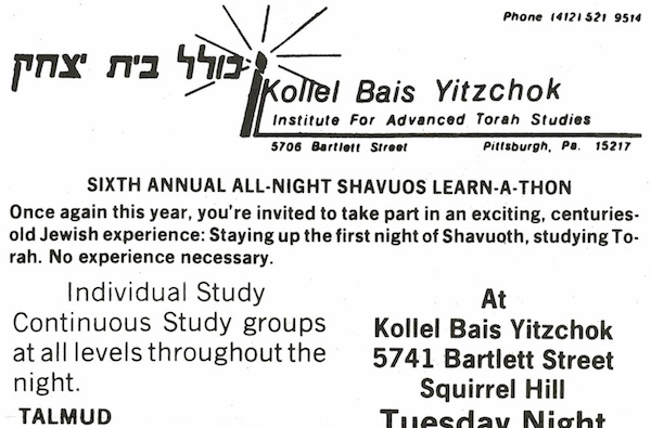 Poster for “Sixth Annual All-Night Shavuous Learn-A-Thon” hosted by Kollel Bais Yitzchok Institute for Advanced Torah Studies.