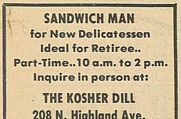 Classified advertisement for “sandwich man” at the Kosher Dill restaurant at 208 N. Highland Ave.